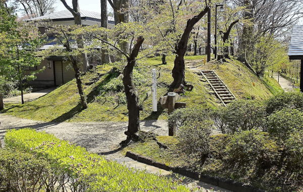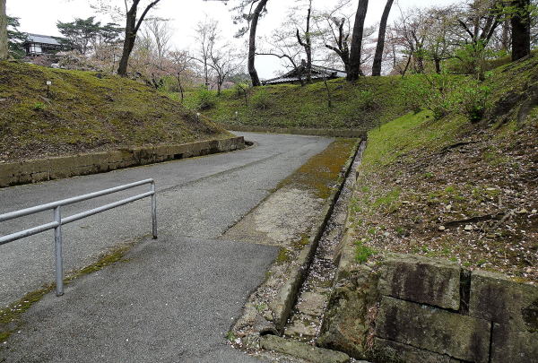 ![]() 黒門跡の枡形 久保田城の土塁は、要所を屈曲させ、横矢掛りとしている。 |