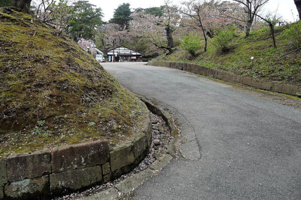 ![]() 枡形を過ぎると二の丸跡 売店の右上方には表門と御物頭御番所が建つ。 |