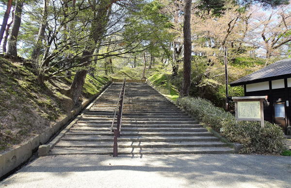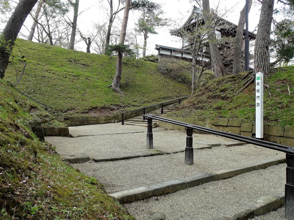 ![]() 長坂門跡と表門 長坂門は本丸の玄関口であ表門(一の門)の前に設けられており、二の門とも呼ばれていた。現在、久保田城跡に唯一残っている御物頭御番所(秋田市指定文化財)がこれらを管理していた。長坂門の名称は、二の丸から本丸へとのぼる長い石段「長坂」にちなんで名付けられたものである。 |