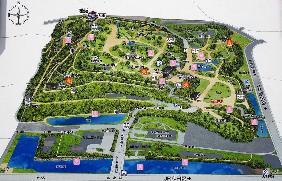 【所在地】秋田市千秋公園1番(右の地図はJR秋田駅近くの案内板より) 【交 通】 JR秋田駅から徒歩約10分 【城地種類】 標高45mの神明山の丘陵上に築かれた平山城 【現 況】 千秋公園(秋田市指定名勝)として整備され、御隅櫓、表門などが復興されている。千秋公園は、秋田藩主佐竹氏が12代約270年にわたって居城とした久保田城跡を、明治期の造園家長岡安平の設計によって整備した近代公園である。 公園整備は、本丸御殿の御池や城内の土塁・通路などの遺構を活かして行われ、明治30年(1897)に近代的な城跡公園として千秋公園が完成した。城跡を本格的に公園化する事業は、全国でも初の試みであり、千秋公園は、全国の城跡公園および近代公園のさきがけとして貴重であることから、秋田市の名勝に指定された。平成20年3月25日指定。 千秋公園の命名者は、秋田県出身の漢学者・狩野良知で、「千秋」の由来は、秋田の秋に長久の意の千を冠し、長い繁栄を祈ったものとされている。 【千秋公園が選定された主な『100選』】 ●日本の都市公園100選 ●日本の歴史公園100選 ●さくら名所100選 ●池坊逍遥100選 ●日本100名城 |