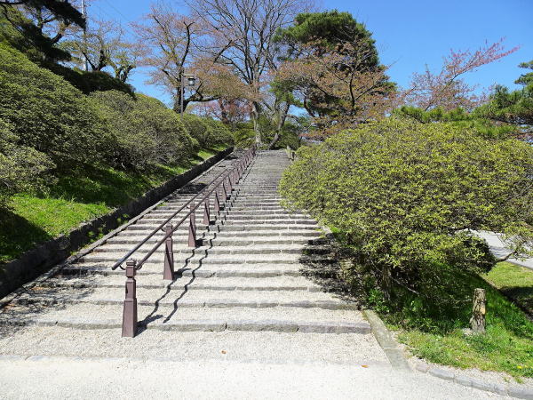 ![]() 長坂の石段 鉤の手に折れながら、長坂門跡、表門にいたる。 |