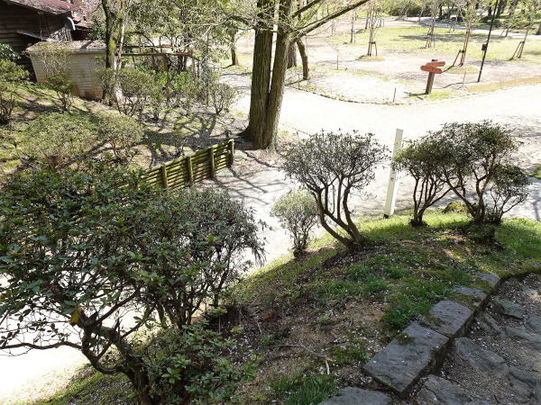 ![]() 帯曲輪門跡 本丸の奥から二の丸の土門方向へ通じる門であり、本丸の下の帯曲輪に続いている。門の構造等は不明であるが、絵図等の記載では、土塁の上を巡る板塀に連結される形に描かれている。 |