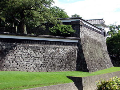 熊本城の石垣は「清正流石組」と呼ばれ独特の弧を描く扇の勾配。下は30度ほどとゆるやかながら、上に向かうに従って角度を高め、天端では75度の絶壁になっている。