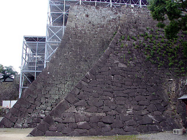 清正時代のゆるやかな石垣(右)、細川時代の急勾配の石垣(左)