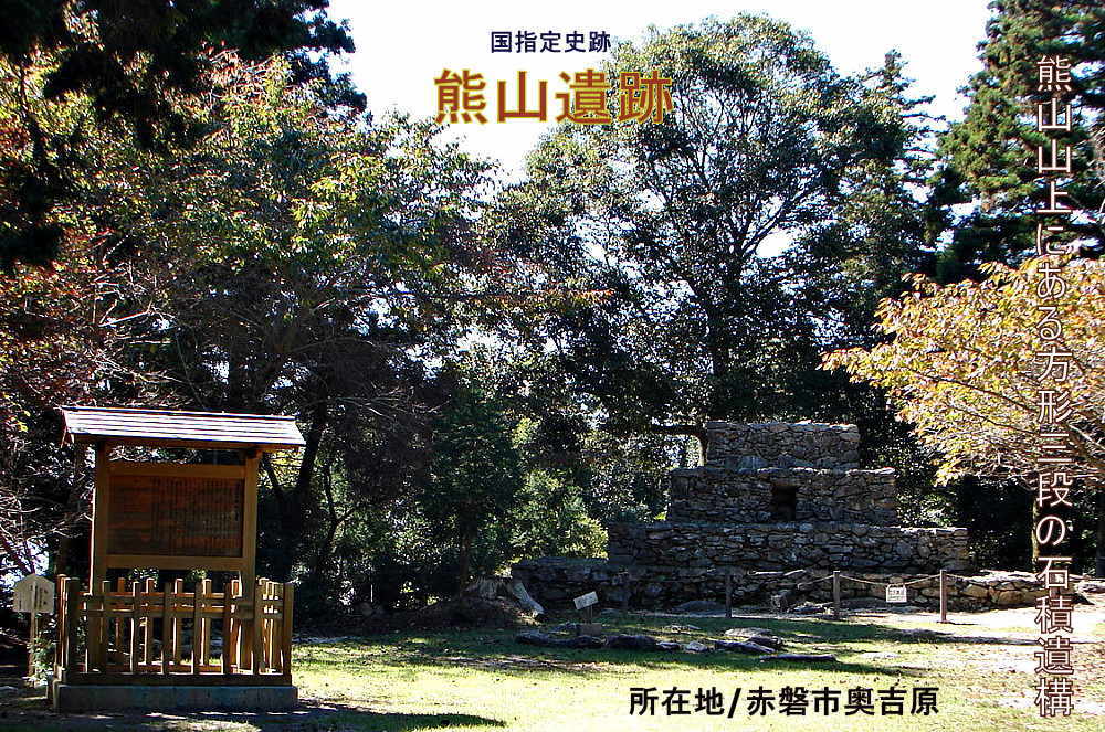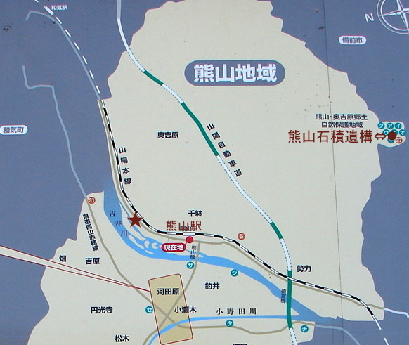 ![]() JR熊山駅の南方約3Kmに位置する熊山遺跡に行くルートは車道と遊歩道の二つがあり、車の場合は★印のところから上がっていきます。駐車場まで約25分です。 ※「熊山」の由来〜もとは吉備の国の中心から離れた、かくれたところ、吉備地方の東南の隅(=すみ)の霊山というところから、「くまやま」とよばれていた。中世の文献に、「熊山」と表記されている。 |