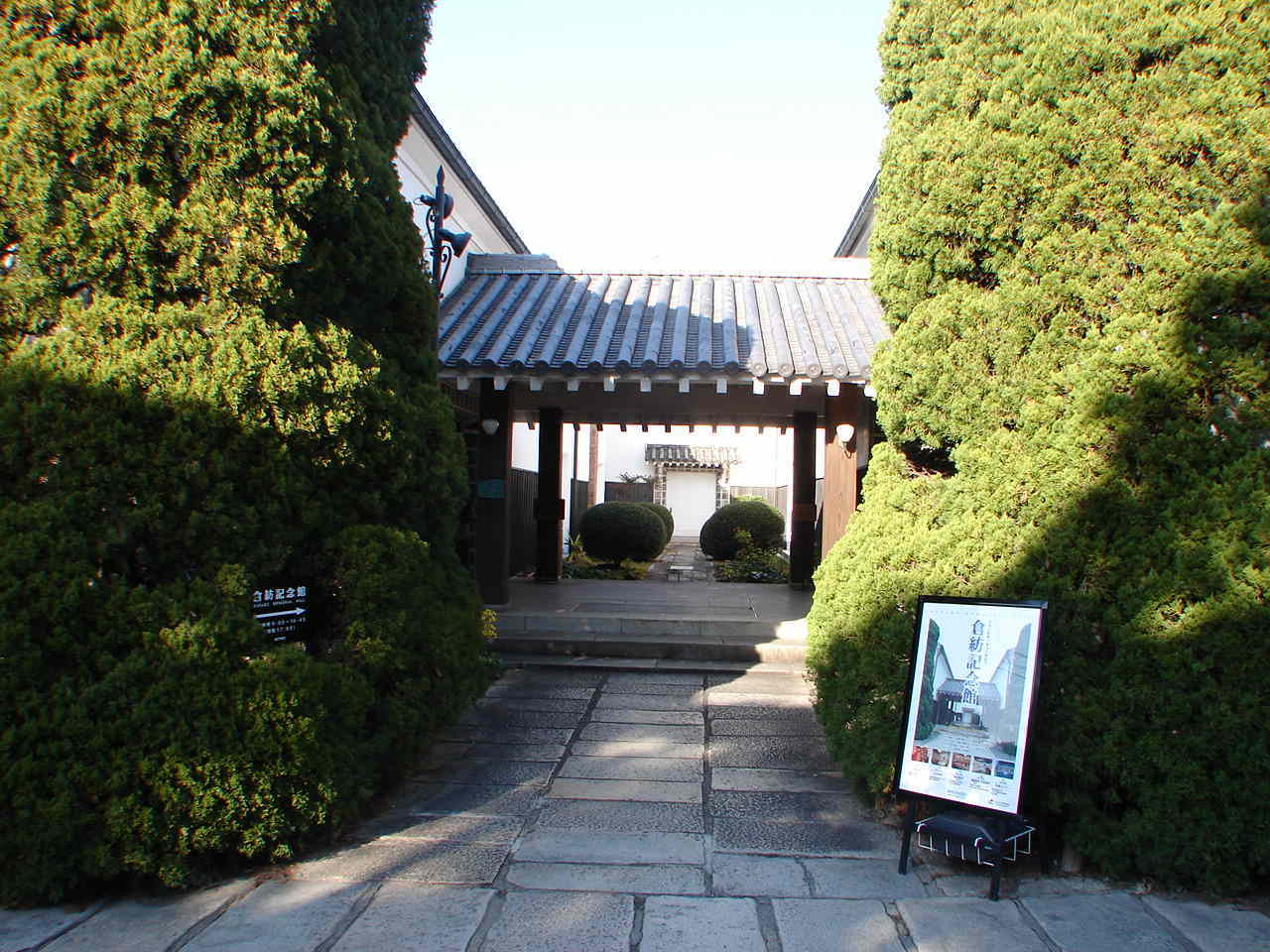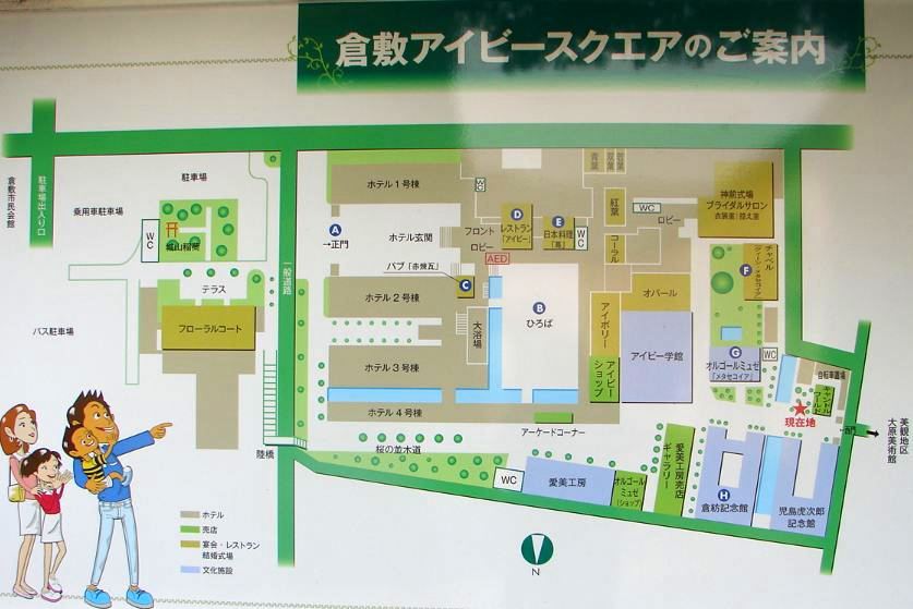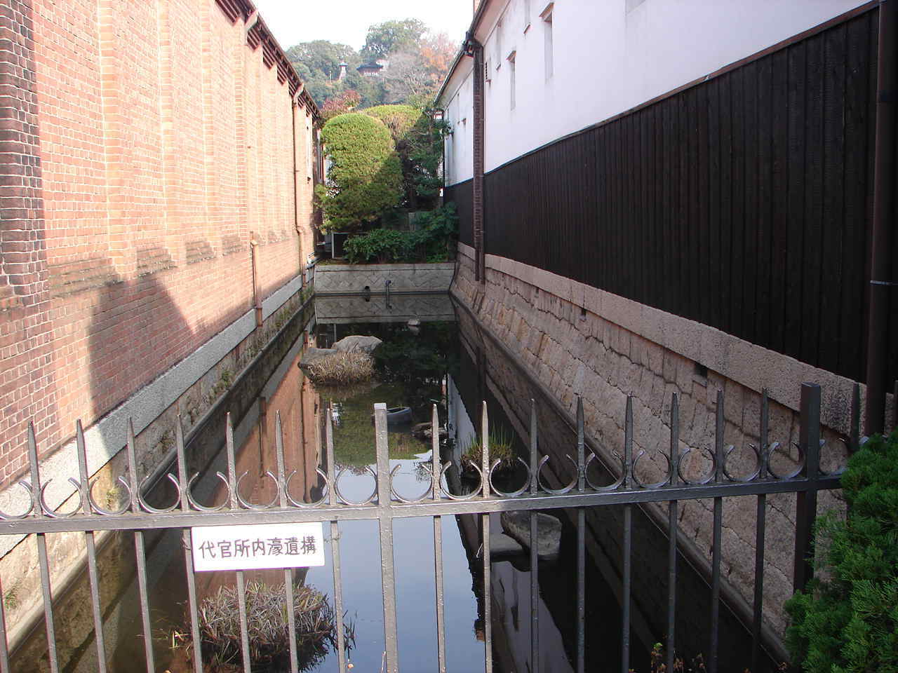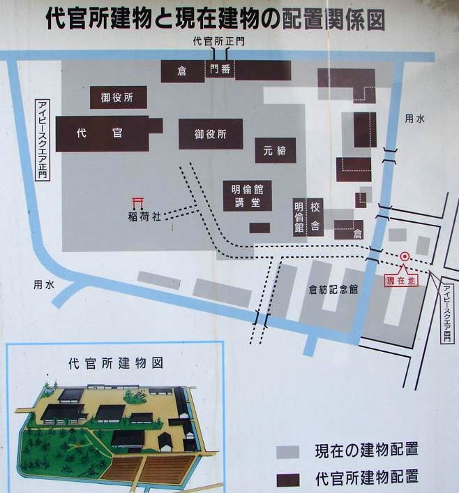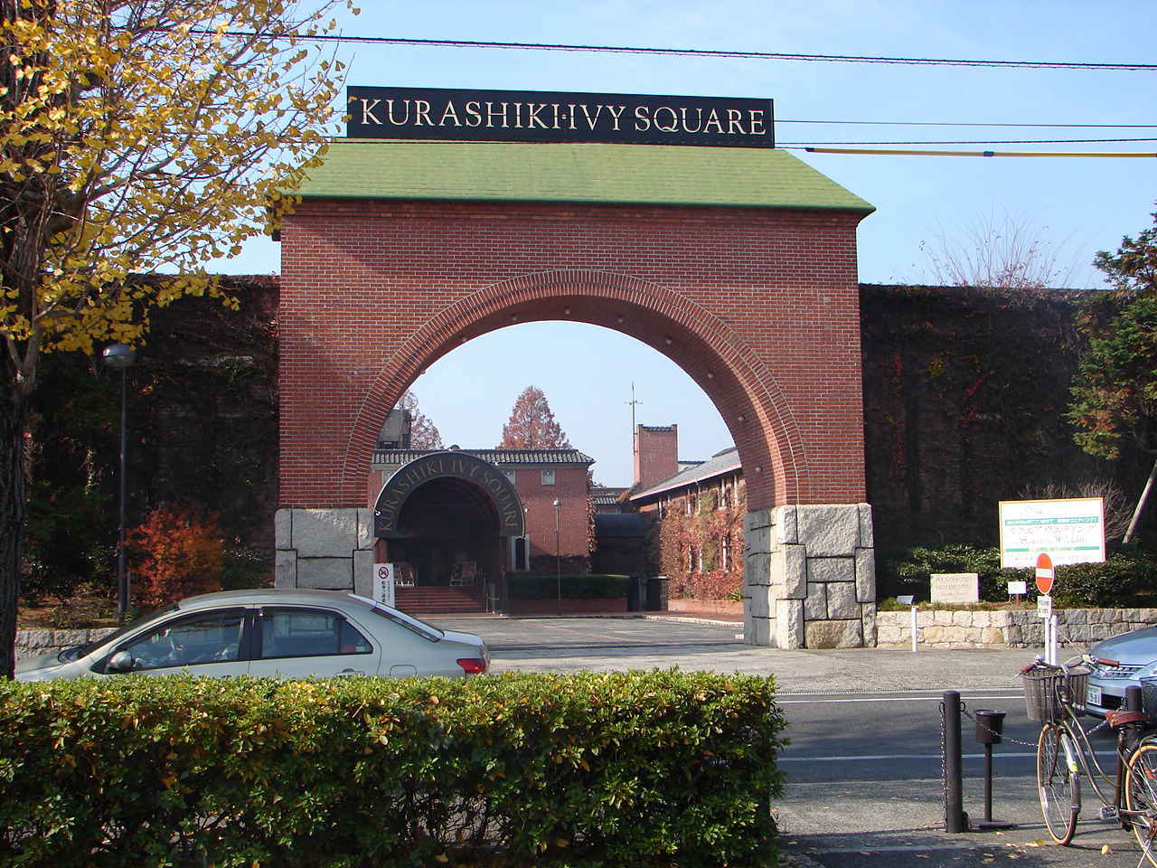 ■倉敷アイビースクエアは、もと江戸幕府代官所のあった場所で、倉敷紡績所(現クラボウ)発祥の地でもある。終戦後は休止工場となり、再び生産工場に復活することはなかった。アイビースクエアは、この工場を倉敷美観地区にふさわしい施設として、昭和49年(1974)に誕生。現在では、蔦のからまる赤レンガ造りのホテルや多目的ホール、工房、店舗、また、付属文化施設として倉紡記念館、児島虎次郎記念館、博物館、アイビー学館などを持つスクエア(一角)として存在する。※なお、現在地の処に代官所濠遺構が残る。