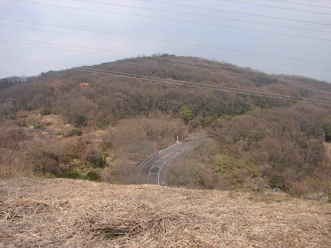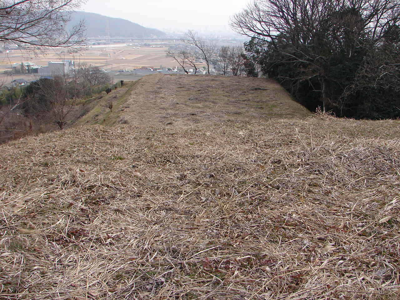 ![]() 後円部から見た前方部 前方部後方の平野は、この古墳が築造された当時は海であった。 |