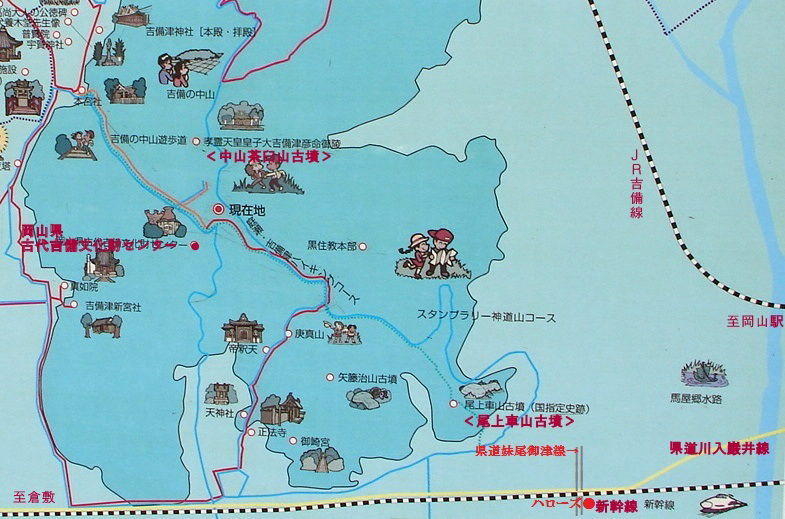 ![]() 周辺図(現地案内板に文字等を付け足しています) ■尾上車山古墳 「所在地」岡山市北区尾上 「アクセス」山陽新幹線北側の県道川入巌井線(242号)と県道妹尾御津線(61号)の交差する信号(スーパーハローズあり)を北(上)に進み、二つ目の信号(岡山県古代吉備文化財センターの表示あり)を左折 ■中山茶臼山古墳(なかやまちゃうすやまこふん) 「所在地」岡山市吉備津 「アクセス」岡山県古代吉備文化財センターの東側に登り口がある |