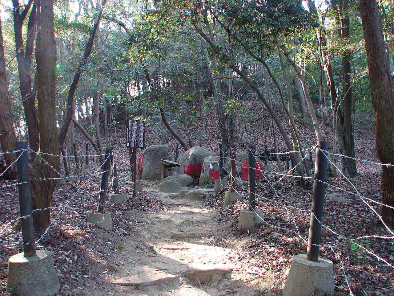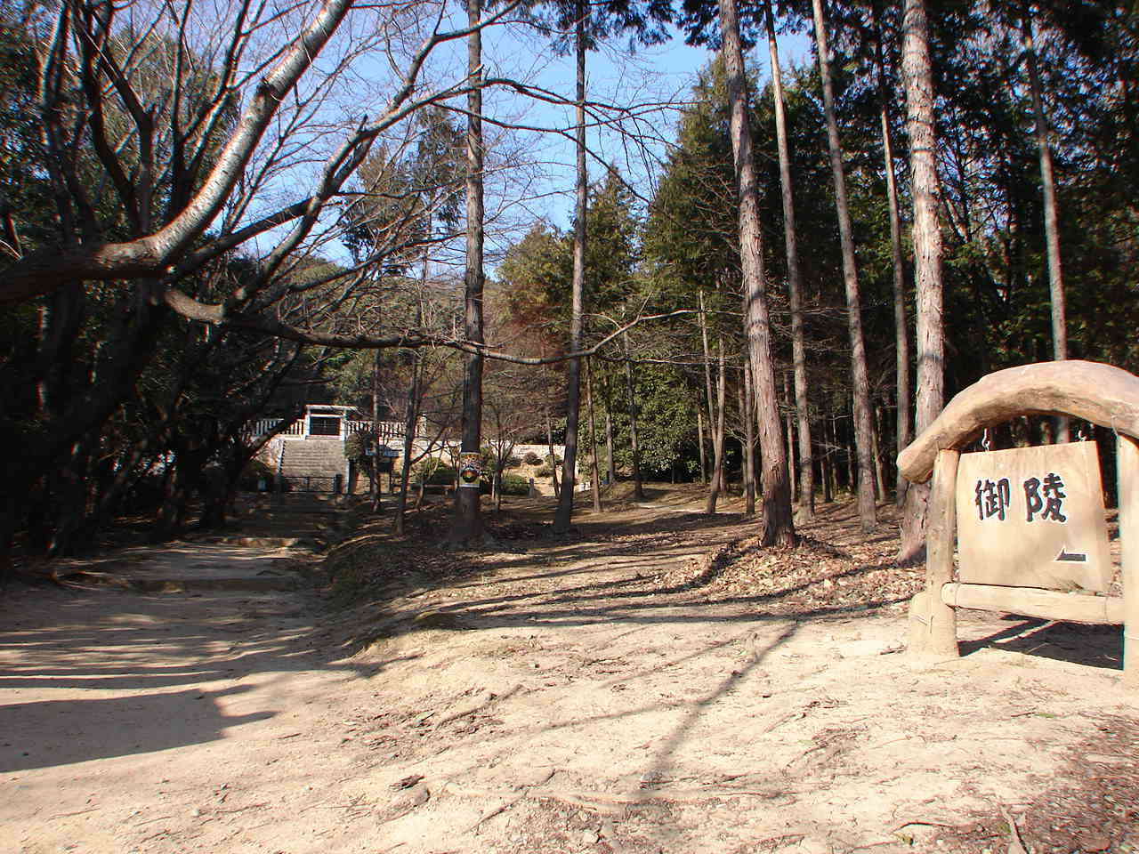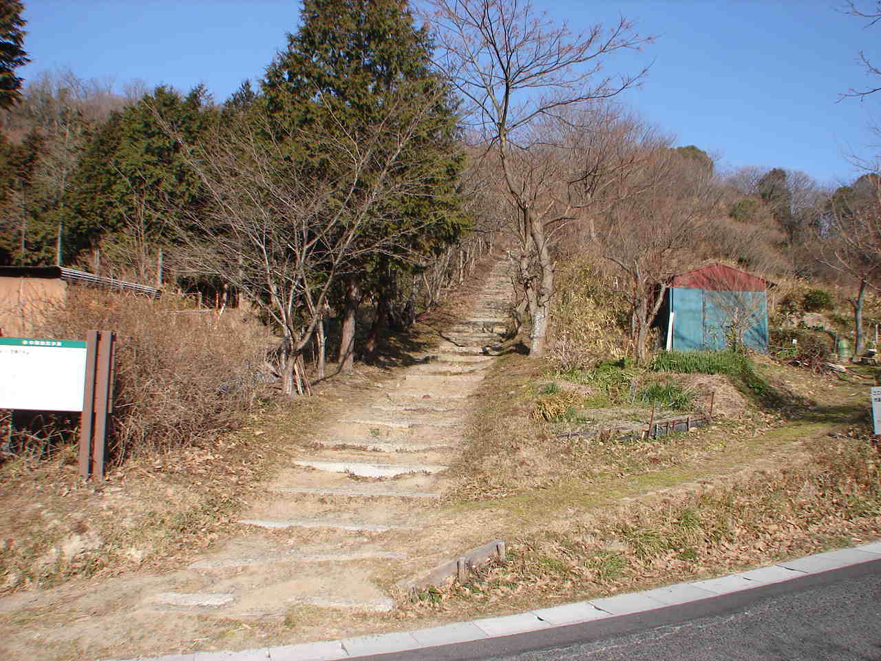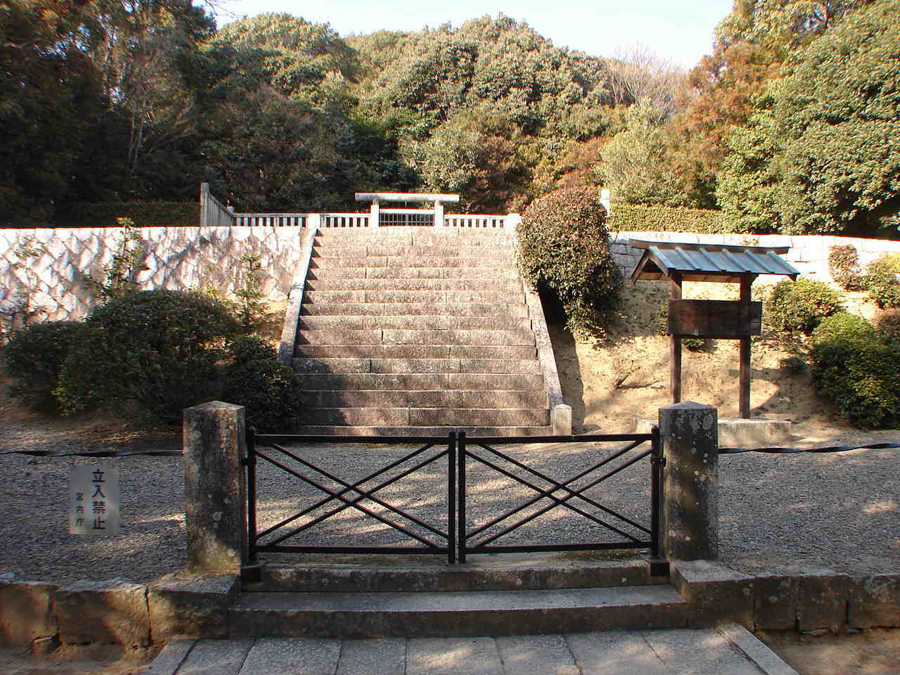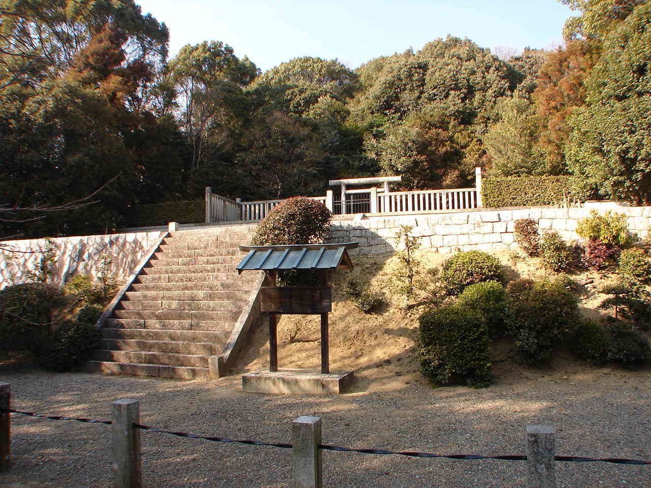 ![]() 石段をあがった所 御陵の標識と、左奥は中山茶臼山古墳。 |