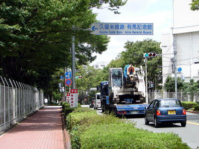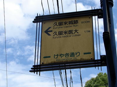 ![]() ▲(左)JR久留米駅と「からくり時計」。(右)久留米城周辺図@の地点にある城への標識。ここから城まで約900m。 |