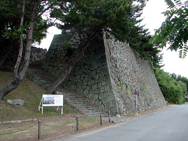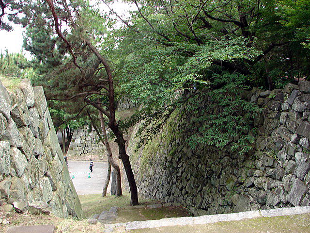 ![]() 本丸南西部のほとんど反りのない直線的な高石垣 |