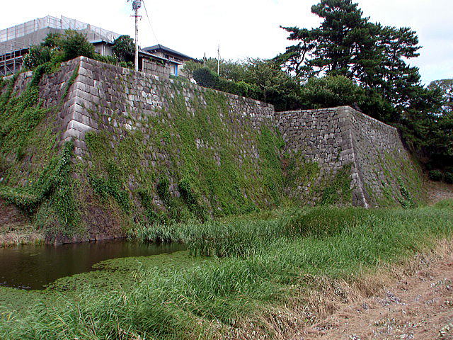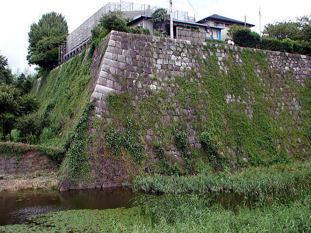 | 遺構 | ![]() 本丸の石垣と堀が現存(写真は本丸南西部の高石垣) |