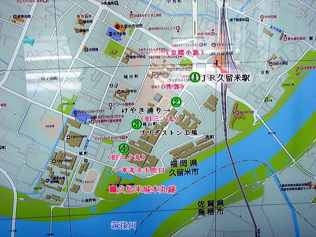 | 歴史 | 永正年間(1504〜21)に筑後川ぞいの小高い山に築かれた平山城が、久留米城の始まりとされる。高良山勢力の出城であったらしく、天正11(1583)年から3年間、高良山座主麟圭(りんけい)はこの城に籠り、豊後大友氏と戦っている。天正15年、豊臣秀吉の九州国割により、久留米城には毛利秀包が入城する。関ヶ原の戦いで毛利家が断絶すると、田中吉政(よしまさ)が筑後一国の領主となり、筑後北部の支配の拠点であるこの城には次男則政(のりまさ)が置かれた。 元和7(1621)年、有馬豊氏が田中家の改易をうけて筑後北半21万石の大名として入城し、幕末まで有馬家の城下町として栄えることになる。 有馬家は入国当初から約40年かけて、廃城となっていた久留米城の大改修を行い、本丸・ニノ丸・三ノ丸・外郭に濠を廻す連郭式城郭を建設している。ニノ丸以下の郭にあった町家・寺社を城外に移転させ、それを守るような形で荘島(しょうじま)・櫛原(くしはら)・京隈(きょうぐま)などの士屋敷を配置した城下町を作りあげている。この城郭と城下町が現在の久留米市街地の骨格になっており、市街地には往時をしのぶ多くの史跡を見ることができる。 |