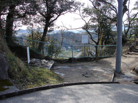 ![]() 男井戸・女井戸側から復興天守へいたる道 坂を上がった所に復興天守が位置し、その手前の男井戸・女井戸。 |