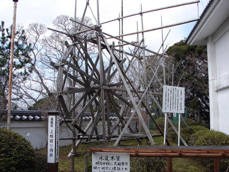![]() 「上総掘り」 井戸掘り櫓 明治の中頃、君津地方で考案され、飲料水、かんがい用水はもとより、石油や温泉の発掘にも使用された「上総掘り」方式の井戸掘り櫓です。なお、現在でも東南アジアやアフリカの諸国で使用されています。右の建物は君津市立久留里城址資料館。 |
