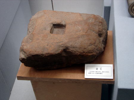 ![]() 礎石(資料館展示物) 二の丸から切り出し、加工された砂質シルト岩製の礎石。 |