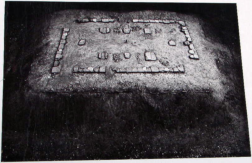 二の丸・長屋塀跡この長屋塀(復原)は、二の丸の西側に位置し、眼下に三の丸を望む場所に建てられていました。本来は、多門櫓に近い性格の建物ですが、寛保年間の絵図に「長屋塀」と記されているところから、この名称を使っています。 長屋塀は、細長い形をした長屋風の建物で、用途は主として諸道具を収納する倉庫に用いられていたと思われます。調査の際確認した礎石は、全体の約二分の一程度でしたが、配列状況から判断して、長屋塀の規模は絵図に記載されている通り、ほぼ十間(十八メートル)×二間半(四・五メートル)であると推定されます。 礎石のつくりは、天守台に比べてかなり粗雑で石質も悪く、ノミによる整形の跡がみられます。これらの礎石は、ほとんどが赤褐色の砂岩で、二の丸から切り出した石を使用しています。また、礎石からおよそ一尺(三十センチ)程離れたところに、軒に沿って瓦が立てた状態で埋められていますが、これは、軒からの雨だれを受ける「雨落ち溝」の役割を果たしたものと考えられます。 |