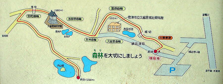 ![]() 『久留里城案内図』(現地説明板より) 麓から天守閣まで約610メートル。久留里城本来の姿を知るためには、できれば舗装道路ではなく古道を歩くことをお奨めします。 |