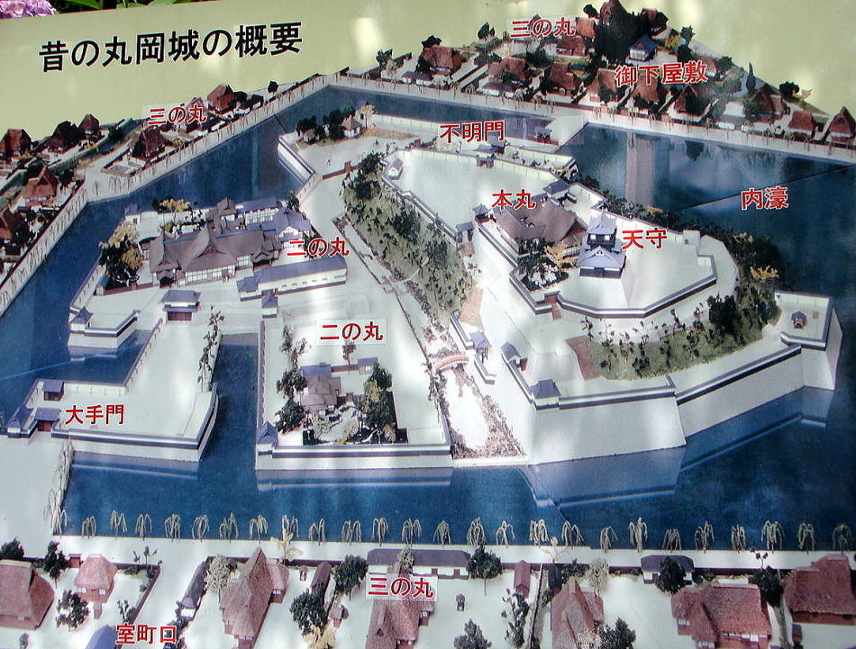 ![]() ▲丸岡城下略図(現地説明板より) 天守閣の東(天守閣の右下)に「東の丸」、北(天守閣右)に「二の丸」を設け、周囲に五角形の内濠を巡らし、河川を利用して外濠とした。慶長18年、本多成重が城主となって城郭を完成し、続いて武家屋敷を配置し、寺院・民家を整備して城下町を形成した城内には櫓・門・役所・長屋などがあり有馬時代には領内の統治が行き渡って藩政の中心地となった。 ちなみに、略図に記されている●西三の丸の場所はバス停「丸岡城」が立つ所で、内濠の西側、丸岡城追手(大手)門前の三の丸で、現在の霞町一、二丁目のあたりである。ここには藩の重臣の屋敷が並び、御役所もあった。 ![]() ▲復元イラスト(現地説明板より) 五角形の内濠(幅・最大91m)に囲まれた中に、本丸・二の丸が配置され、内濠の外には三の丸が四周を囲む。現在では、本丸のみを残して内濠も埋立てられ、本丸周辺は市街地となり、城山を巡る道路の形状に五角形の濠の面影が残る。 |