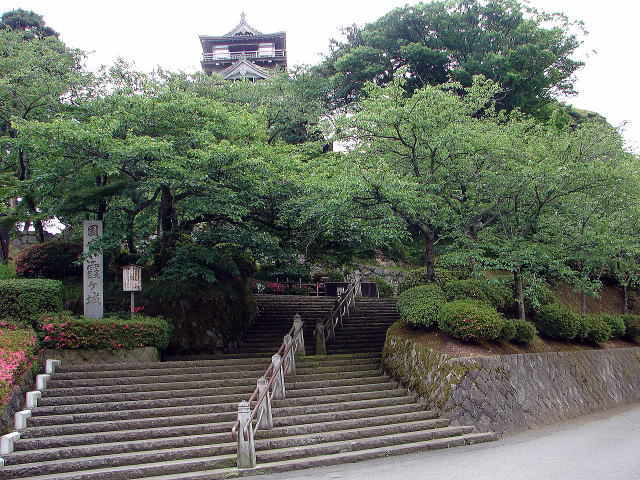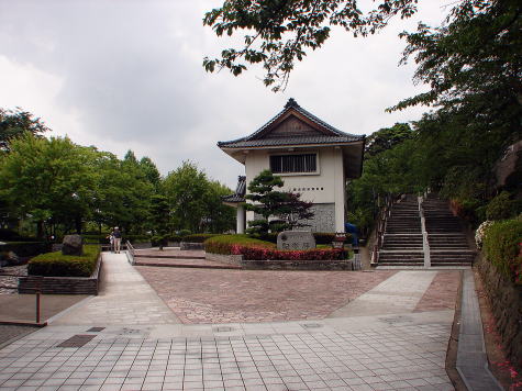 ![]() ▲天守閣へ至る石段 「歴史民族資料館」右側の天守閣へ上がる石段登り口。石段道筋には「一筆啓上賞」と題して手紙文の公募をおこない、入賞した作品が掲示されている。 |