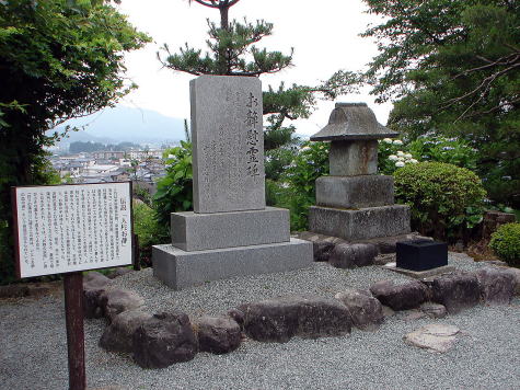 ![]() ▲伝説「人柱お静」 柴田勝豊の築城時、天守閣の石垣が何度積んでも崩れるので人柱を入れることになり、息子の出世を約束に人柱となったお静の悲話を刻む。「堀の藻刈りに降るこの雨は いとしお静の血の涙」という俗謡が伝えられている。 |