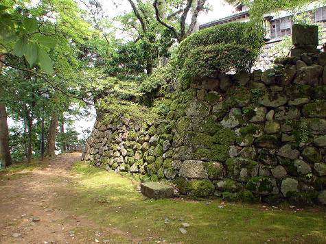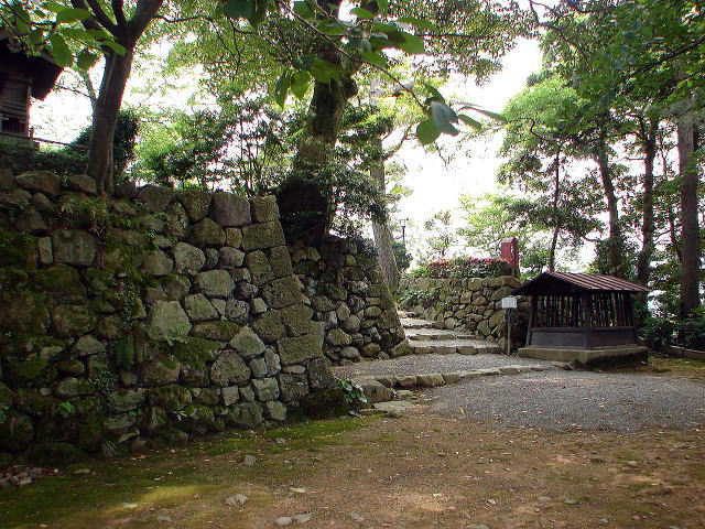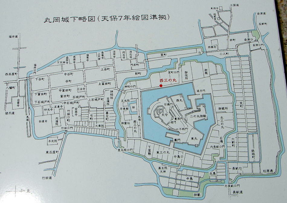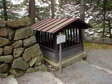 ■井戸「雲の井」周辺の石垣天守下にある井戸「雲の井(右端の屋根のある所)」のあたりは福井大震災のときでもくずれなかったといわれている。 丸岡城は、明治3年3月、版籍奉還後、同4年9月官有となり、さらに民有に移り、明治34年8月町有となる。 その間、濠は埋められ、城門、武家屋敷等の建物は売却または譲渡され、現在わずかに天守閣とその附近の石垣の小部分を残存するだけとなった。 |