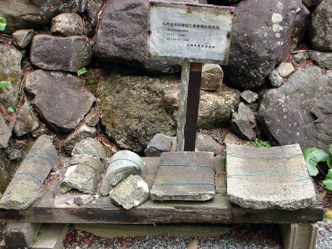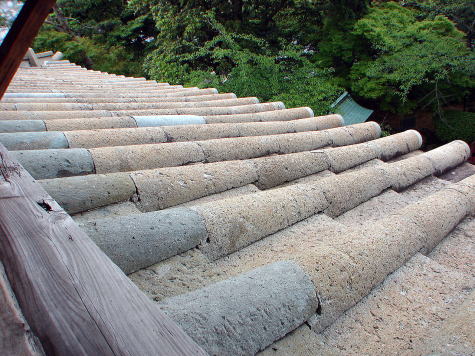 ![]() ▲笏谷石(しゃくだにいし)の天守屋根瓦 笏谷石は、福井市足羽山(あすわやま)や一乗谷付近で採石される。 |