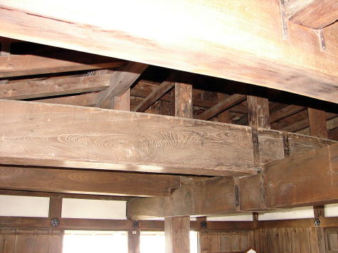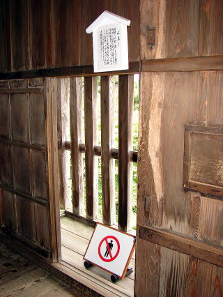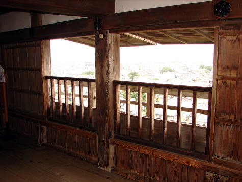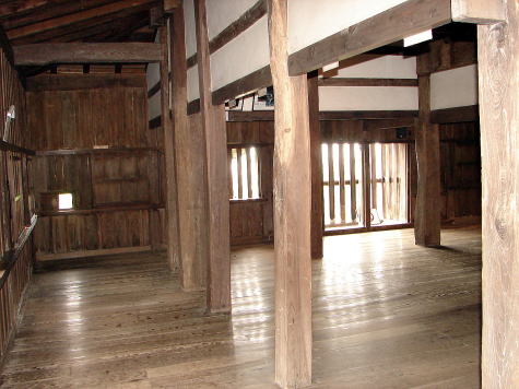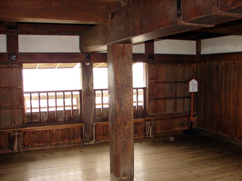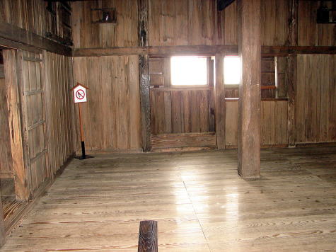 ![]() ▲天守三階内部 回縁(まわりえん)は、3階内部からみると窓の外にある。回縁の床も3階内部より高くなっている。 |