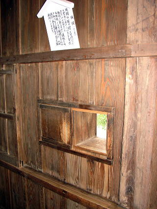 ![]() 【写真上】 天守1階内部〜左より箱狭間、突き上げ戸、出格子(出窓) 【写真右】 箱狭間〜鉄砲用と弓射用の箱狭間が交互に設置されている。 |