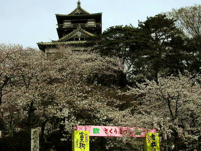 ■丸岡城天守現在は、望楼型天守と天守台石垣が残る。 写真は4月に行われる丸岡城桜まつりの様子。 丸岡城のある霞ヶ城公園は、桜の名所100選に選ばれている。 |