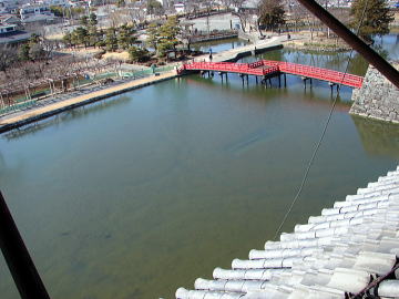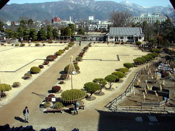 ![]() 天守から見た松本城公園(二の丸跡) 後方は三の丸跡にあたる所で、市街化されている。 |