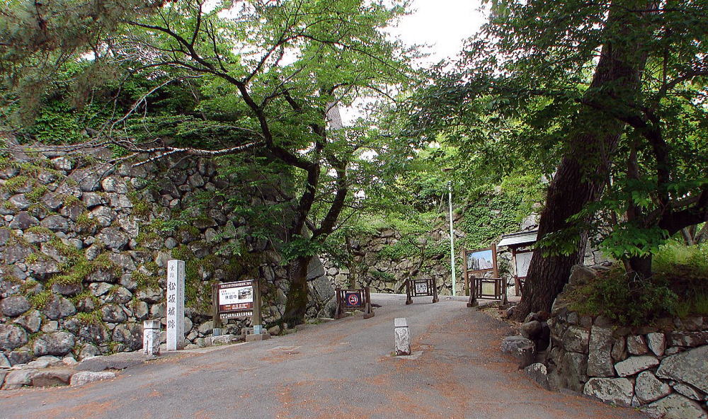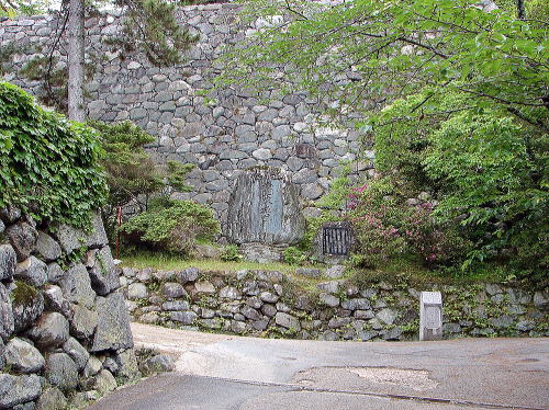 | 【松坂城跡】 松坂城は蒲生氏郷(がもううじさと)が天正16年(1588)この四五百森(よいほのもり)に築城した平山城である。氏郷が陸奥黒川(現在の福島県会津若松市)へ移封後、天正19年(1591)に服部一忠(はっとりかずただ)、文禄4年(1595)に古田重勝(ふるたしげかつ)と城主が変わり、元和5年(1619)に徳川頼宣が和歌山藩主となると同時に和歌山藩領となり、以降、明治になるまで勢州領(松坂・田丸・白子等)18万石を統轄する城代が置かれてきた。 ▼松坂城入口(大手側)〜奥に見える石垣は表門跡 ![]() |