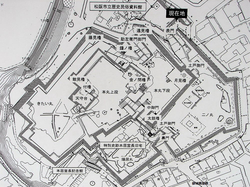 ◆城跡案内図◆![]() 城郭の縄張りについて 本丸は上下2段に分かれる。上段の一段高い天守台に3層の天守が存在し、その北側に天守と連結する敵見櫓、東隅に金ノ間櫓を配置し、下段には南側に太鼓櫓、東隅に月見櫓、北側に遠見櫓を配置し、その間に多聞を巡らせていた。また、二ノ丸に通じる大手筋に表二ノ門(助左衛門御門)、搦手筋に裏ニノ門が置かれた。現在見られる石垣は、蒲生〜古田期に築かれ中心部分はあまり改変を受けていない。上段虎口に蒲生時代の石垣が残る。 二ノ丸は、本丸の東に位置し、南隅に櫓が配され、二ノ丸御殿(徳川陣屋)が建てられた。二ノ丸に通じる大手筋に表門、搦手筋に裏門が置かれた。きたい丸は、本丸の西に位置し、隠居丸は、本丸の南に位置する。現在、曲輪内に本居宣長旧宅(国特別史跡)が移築され公開されている。三ノ丸は外周に堀・土塁を巡らせていた。明治初期に堀が埋められた後、宅地や学校敷地となり、旧松坂御城番長屋の他に当時の面影をとどめるものはない。 (案内図は現地説明板に一部追記、転載) |