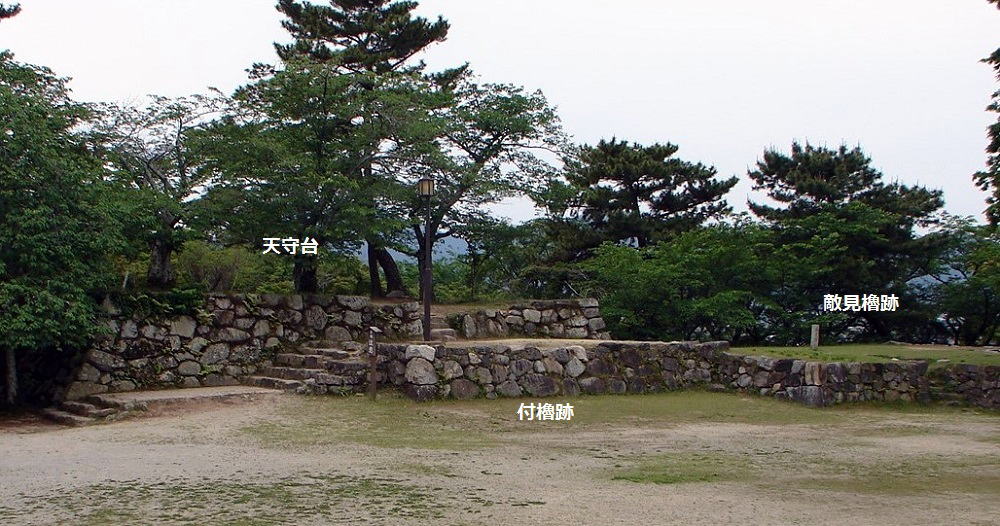 ![]() ▲天守台〜天守台には、3層の望楼型天守(詳細は不明)があったが、正保元年(1644)7月29日の大風で倒壊した。北側には天守と連結する敵見櫓が置かれた。本丸上段一帯の石垣は、築城当時の状況が良好に遺存している。 |