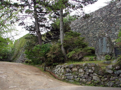 ![]() ▲表門跡 表門は本瓦葺2階建の本格的な櫓門であったが明治初期に破却。松坂城跡碑(1978年建立)後方は本丸下段の石垣。松坂城跡碑の左方向の様子が右写真。 |