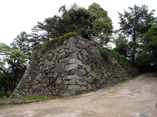 ![]() ▲ニノ丸の石垣 加工され整えられた切り石を用いた打ち込みハギを採用し、石垣の隅は長方形の石材を長短交互に積み上げる算木積みである。 |