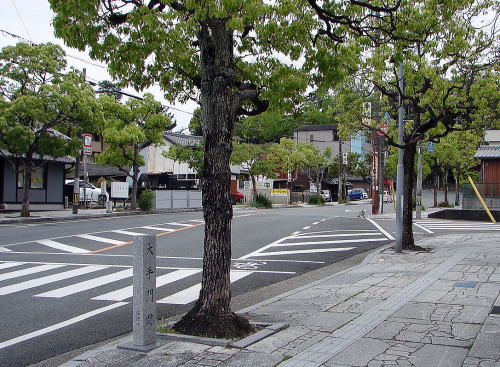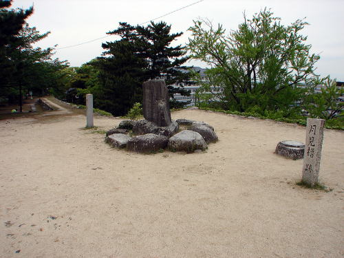 ![]() 松坂城大手門跡(松阪市役所前付近)〜かつて松坂城には、出入口が4か所(大手口、搦手口、同心町南口、5曲口)あり、それぞれに城門があった。城の表玄関にあたる大手口には土塁や石垣が築かれ、門が置かれた出入口は前後の通路と食い違いになって、敵がまっすぐ城内に侵入できない構造になっていた。このような造りを「食い違い虎口」という。 この場所には、俗に「四ツ足御門(建築様式の<四脚門>のことか)」と呼ばれた大手門があり、この門をくぐると城内(三ノ丸)に入る。現在、大手門のあった場所の道路が微妙に曲がっているのはそのためで、大手門は明治初期まで残っていた。右奥が松坂城入口。 |