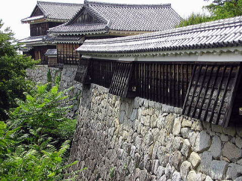 ![]() 乾門東続櫓東折曲り塀の石落 屏風折の石垣上に張り出された袴腰式石落。天守をはじめ、松山城の建造物は、土壁にKい板を貼り付けた「下見板張り」を基調としている。 |