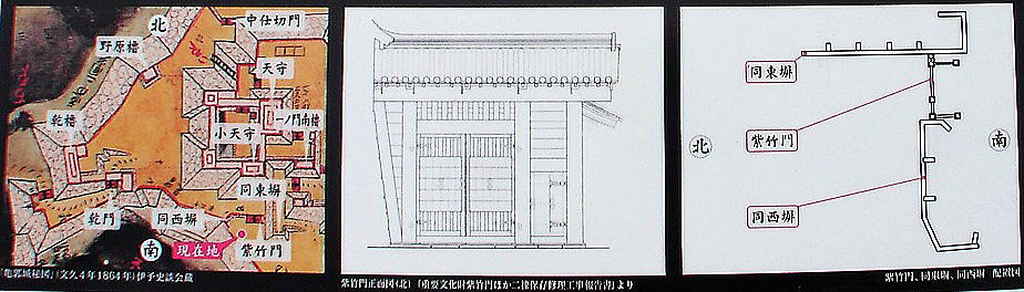 ◆紫竹門・同東塀・同西塀◆![]() (左)亀郭城秘図(中)紫竹門正面図(右)紫竹門・同東塀・同西塀配置図(現地説明板より) |