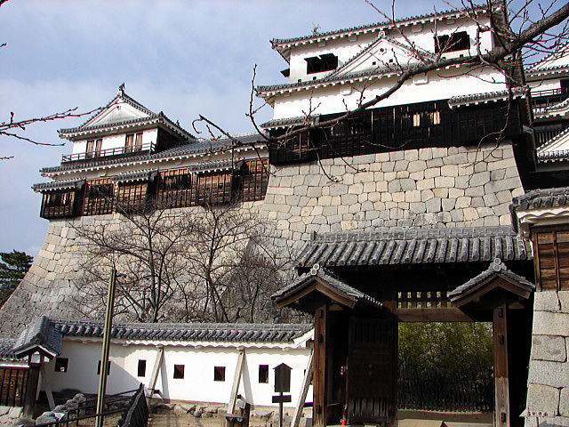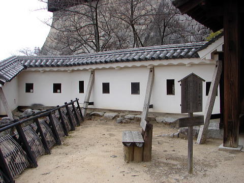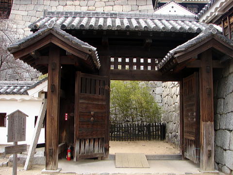 | 紫竹門(しちくもん) 紫竹門は、本丸の大手と搦手を仕切る脇戸付高麗門で、本壇北側にあった中仕切門とあわせ、搦手を固める重要な門です。門の両側には、それぞれ紫竹門東塀と同西塀が接続し、搦手に備えるため北を正面としています。門の前面、小天守下に紫竹が植えられていたことからこの名が付けられ、また扉の上下は竪格子となっており、そこから外を覗き見る工夫がなされています。創建時期はわかりませんが、紫竹門東塀並びに同西塀とともに、天明4(1784)年の落雷で天守とともに焼失し、嘉永年間(1848〜1854年)に再建されたと考えられています。昭和10年(1935年)国宝に指定されましたが、同25年(1950年)の法改正により重要文化財になりました。 |