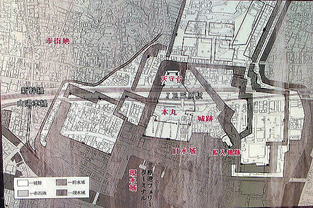 ![]() 白い部分が城跡。かつては瀬戸内の波が三原城の真下を洗った。 現在では本丸、ニノ丸、三の丸、旧水域は、駅前南の繁華街になっている。 |