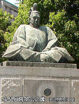 ■三原城は、瀬戸内海の水軍を掌握していた小早川隆景が、永禄10年(1567)沼田川河口の三原湾に浮かぶ大島、小島をつないで築いた城で、天正10年(1582)前後と、慶長元年(1596)のころ偉容を整えたといわれる。■城は、海に向かって船入りを開き、城郭兼軍港としての機能をそなえた名城で、満潮時にはあたかも海に浮かんだように見えるところから浮城とも呼ばれた。 ■小早川氏のあと福島氏、浅野氏の支城となり、明治維新後、一時海軍鎮守府用地となったが、沼田川の堆積作用などを理由に変更され、建物、樹木などが競売に付された。その後、鉄道(現在のJR)が本丸を貫き、明治27年(1894)6月には三原駅が開業した。 ■今では、市街化がすすみ天守台とそれをめぐる濠、船入櫓跡、船入り跡及び本丸中門跡を残すのみである (現地説明板より) ※小早川隆景(こばやかわたかかげ) 戦国の武将・毛利元就の三男で、12歳で小早川家の養子になり沼田(ぬた)小早川家を継いだ。兄の吉川元春とともに、おいの毛利輝元を助けて中国統一を完成させた。吉川とともに「毛利両川(りょうせん)」を形成して宗家を支えた。 |