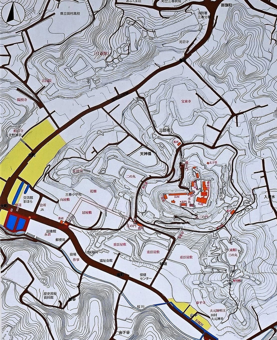 | 【三春城跡概略図】 現在の地形図に、江戸時代の絵図の内容(赤色)と、 現地に残る城の痕跡(縄張図)を一枚にまとめた図です ![]() (現地説明板より) |