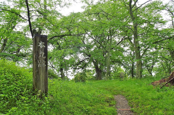 ◆ここから、本丸内の散策です◆![]() 本丸跡は、上下2段に分かれる。現地の標柱は、城図の表門・裏門・三階櫓などが記載されている所には「二之丸跡」の標柱があり、右側部分の広間・台所・御座の間が記載されている所には、「本丸跡」の標柱が立っています(案内図は現地説明板より)。 |