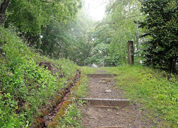 ![]() 本丸裏門跡 左側の一段高い所、説明板の後方が本丸跡、右側は二之丸跡になっています。この場所から下へ降りていくと、石垣、矢倉跡、搦手門となります。 |