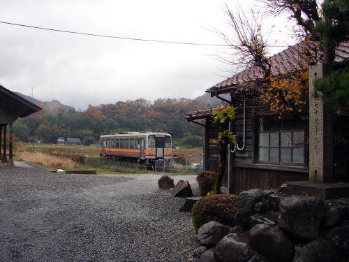![]() 美作滝尾駅を出発した智頭行ディーゼルカー |