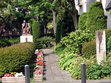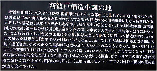 生誕地跡地にたつ新渡戸稲造像。