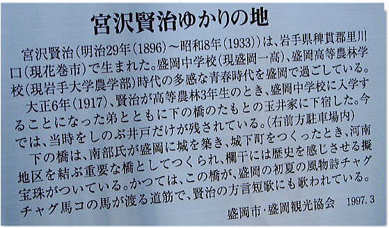 | 下の橋際に建つ「ちゃぐちゃぐうまこ」の歌碑。 歌は4首あり、はじめの1首は、 夜明げには まだ間あるのに 下のはし ちゃんがちゃがうまこ見さ出はたひと |