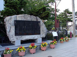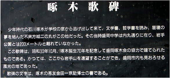 | 石川啄木(1886〜1912) 岩手県南岩手郡日戸村(現在の盛岡市玉山区日戸)にて生まれる。 「三行書き」の短歌という、近代短歌に新たな世界を切り開いた詩人。 (写真左) 盛岡城二の丸に建つ石川啄木の歌碑。 歌碑には、 「不来方(こずかた)のお城の草に寝ころびて 空に吸はれし十五の心」と刻まれている。 |