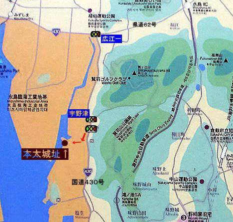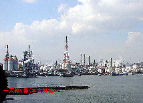 ![]() 水島に望む天神ヶ鼻という岬にあり、海面より43mの高さにて三方を海に囲まれた海城。現在、本太城址周囲は水島臨海工業地帯として発展。 |
